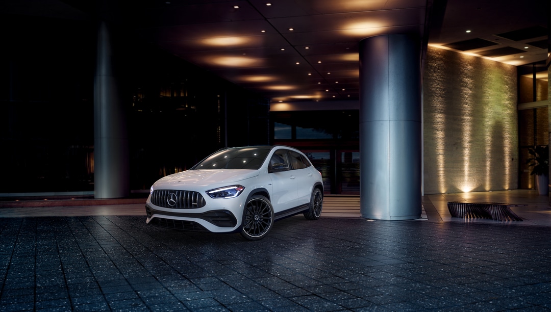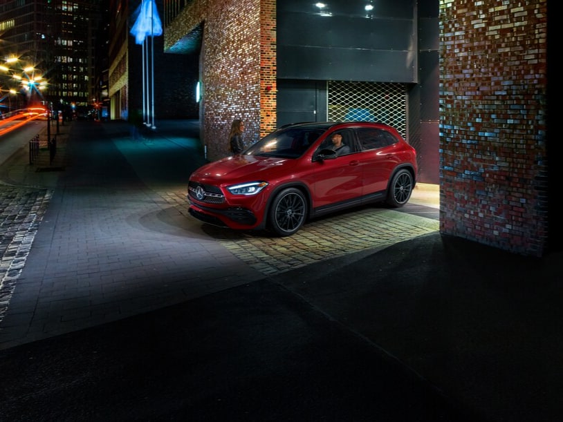 From every angle, the new Mercedes-Benz GLA makes a powerful statement. Its aerodynamic lines, bold front grille, and muscular stance radiate confidence on the road. Eye-catching details like LED headlamps, a chrome diamond-block grille, and 18-inch twin 5-spoke wheels add sophisticated flair. For an extra touch of adventure, the available AMG Night Package includes gloss black exterior accents, a sport brake system, and an AMG-inspired grille.